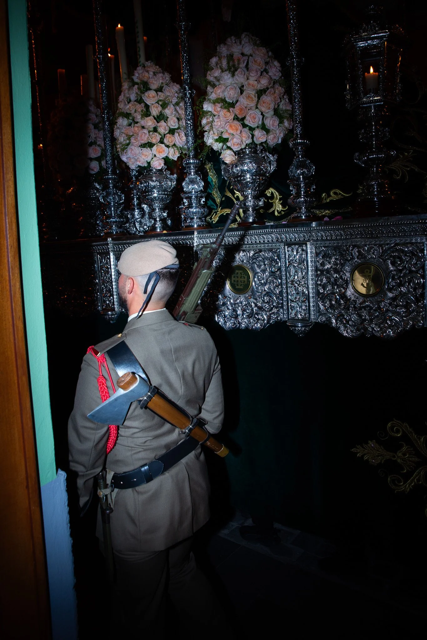 Black and white photograph of a man seated on the floor, viewed from above, with his hands covering his face and head bowed down.