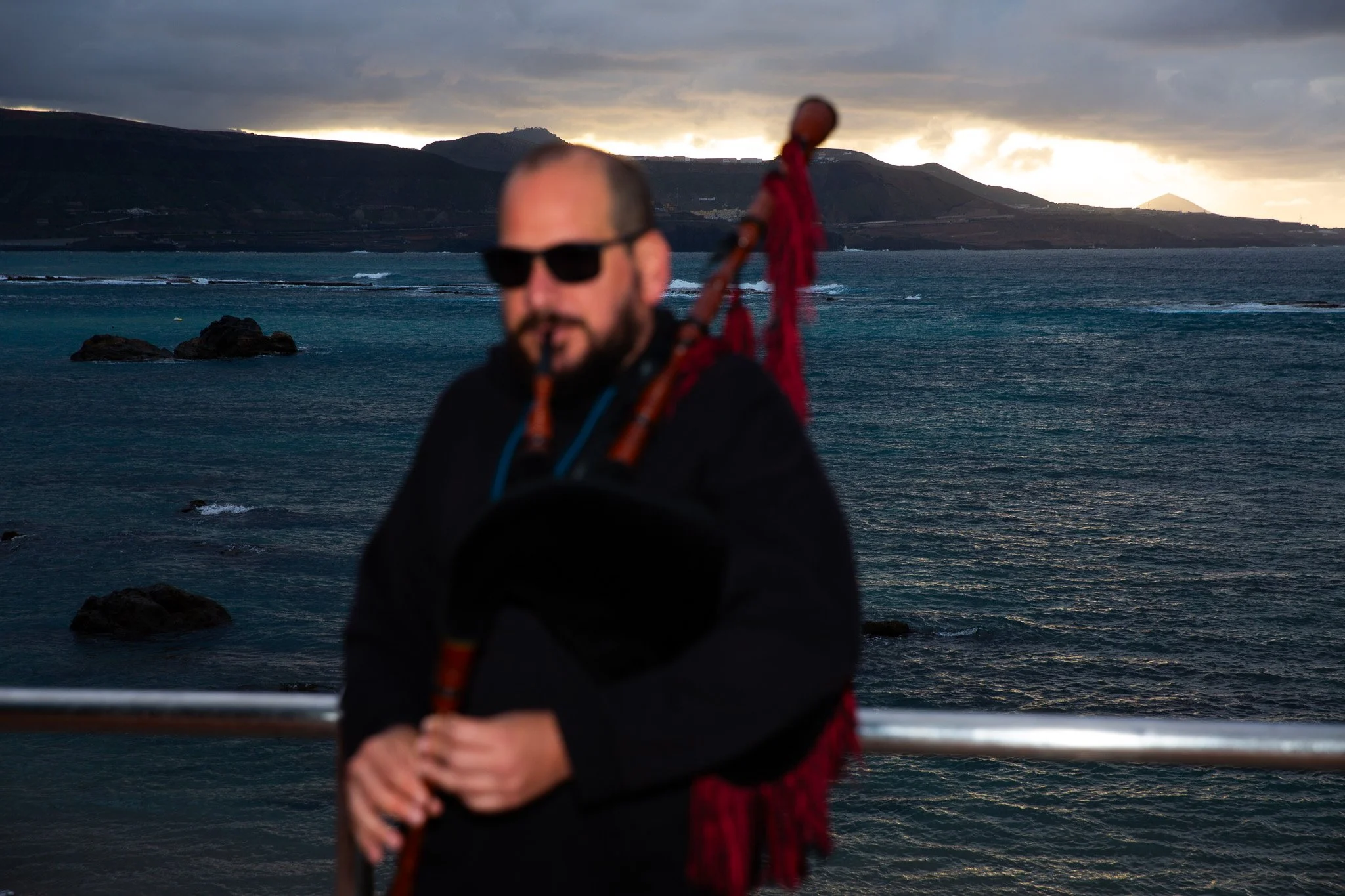 A smiling man wearing a traditional outfit with a black hat, holding a glass of beer and a stick, at an outdoor cultural event or festival, with other people dressed in traditional clothing in the background.