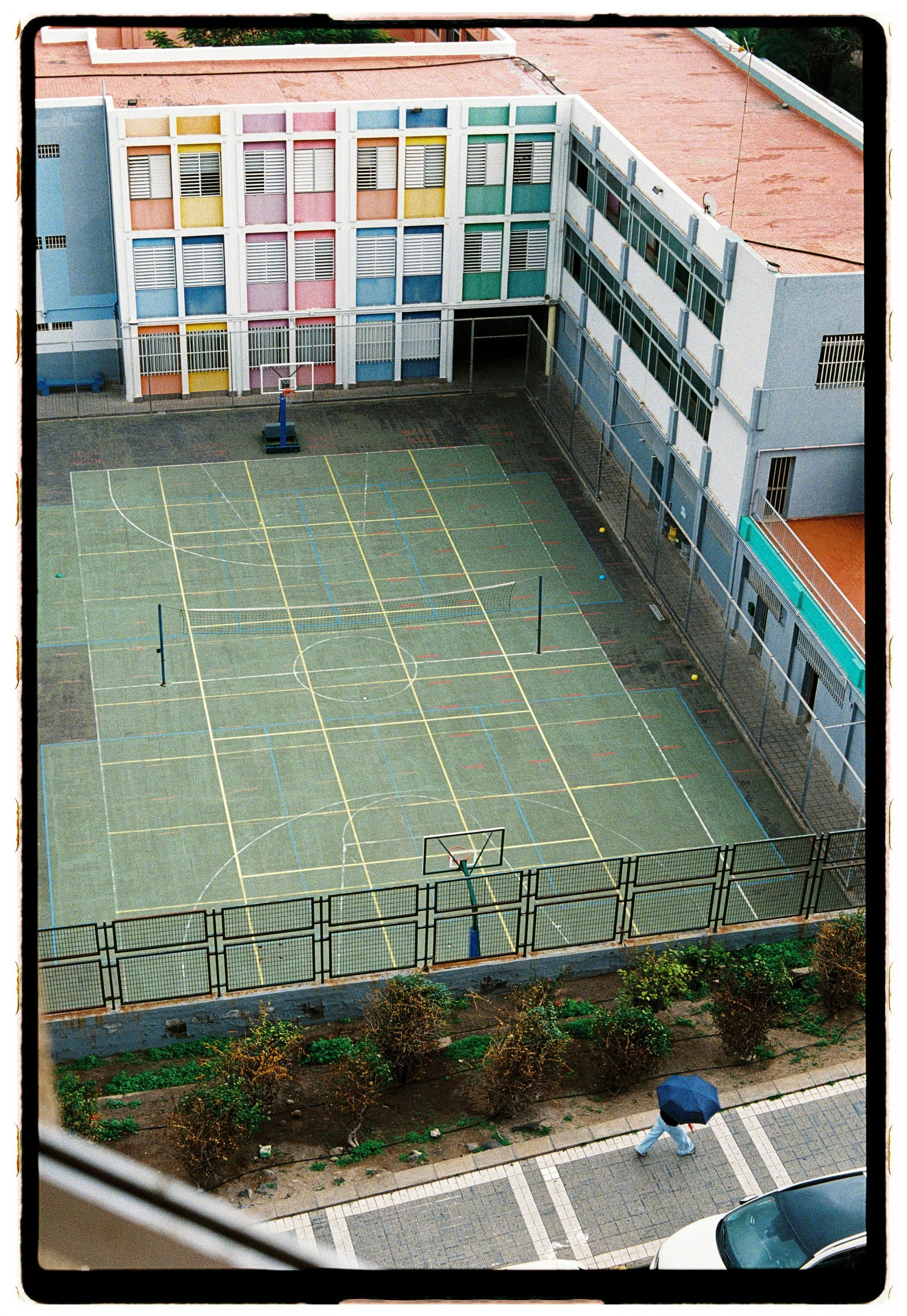 Black and white photo of a skatepark with children skating and playing, trees in the background, graffiti on the wall, and a person bending over near a trash can.