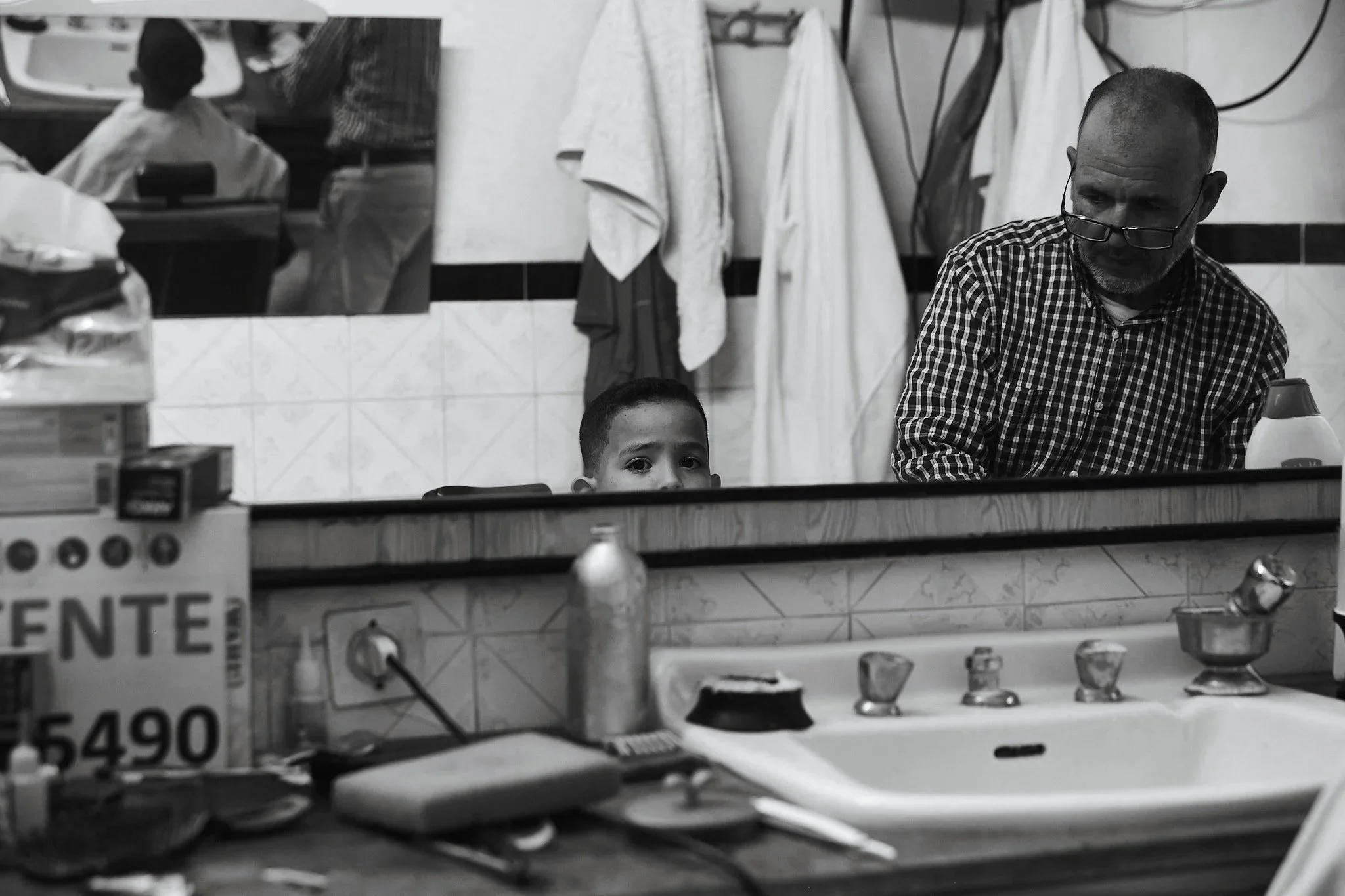 A person getting a haircut at a barbershop, with another person standing next to them, wearing a black cap and shirt, inside a modern barbershop with boxing gloves and framed pictures hanging on the wall.