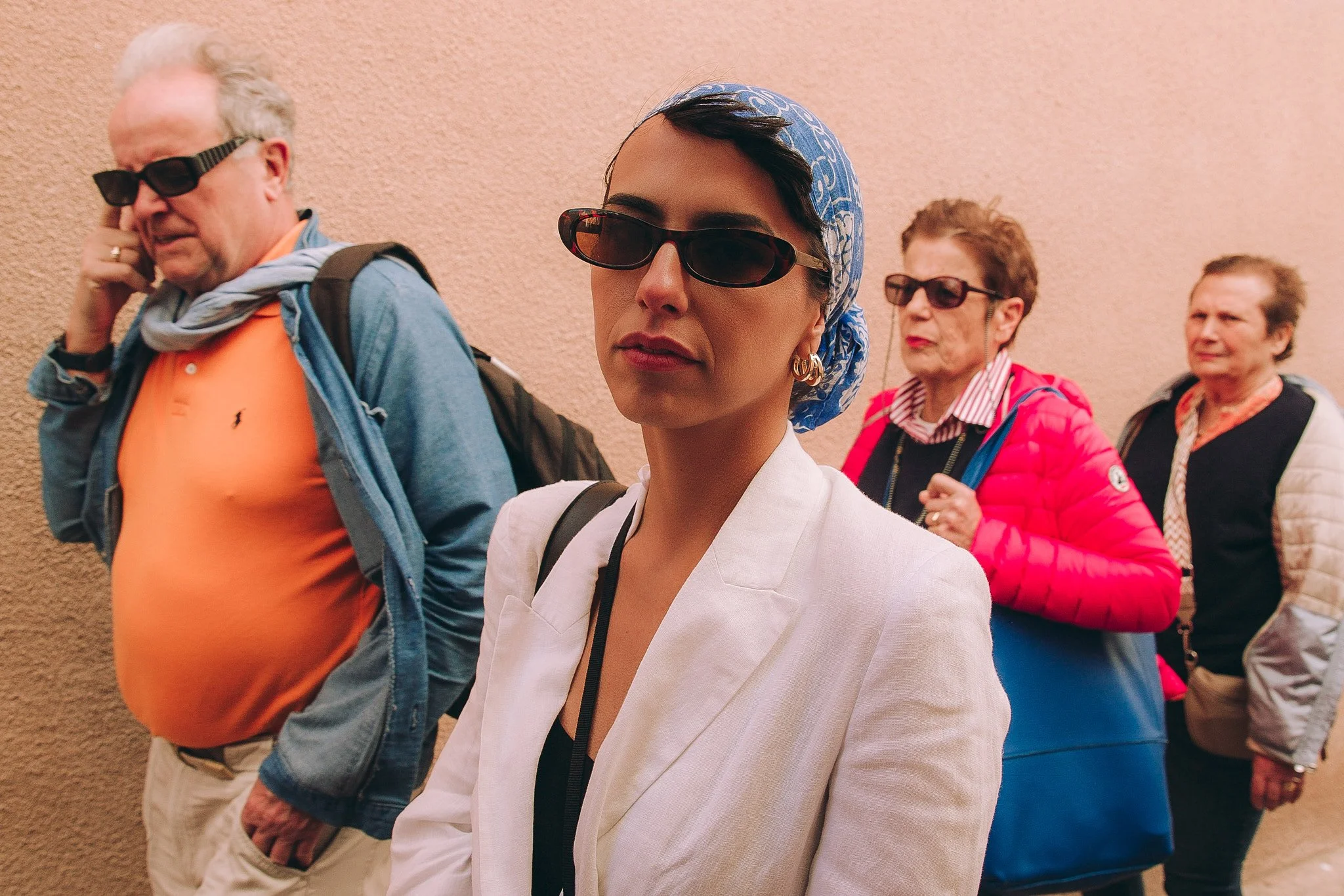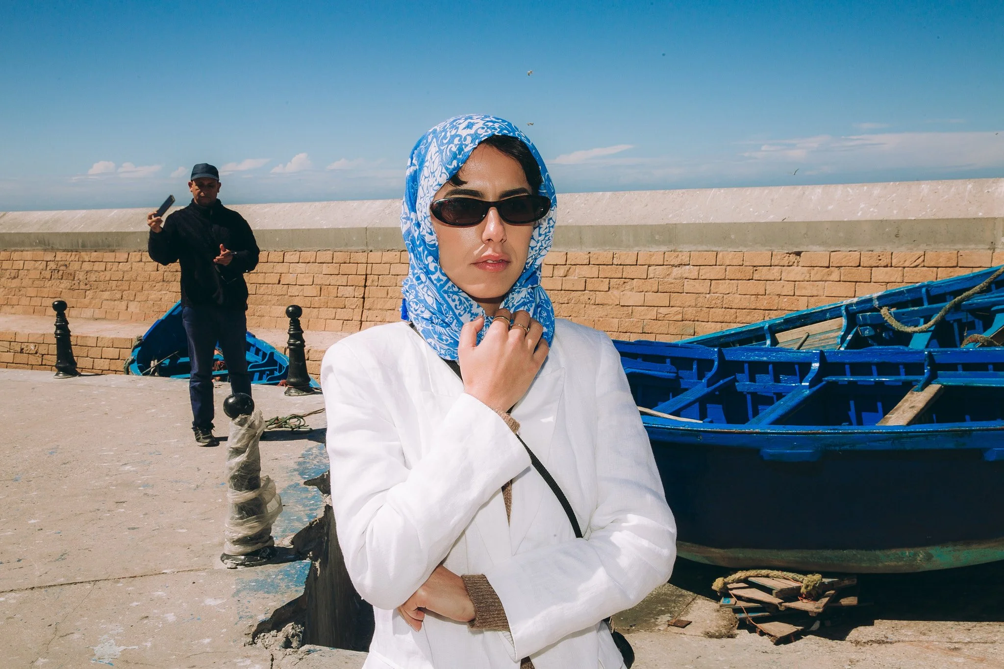 A person sitting on a white chair, wearing a brown leather jacket, maroon wide-leg pants, black shoes, rings, and a headscarf, with a white background.