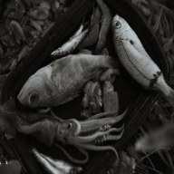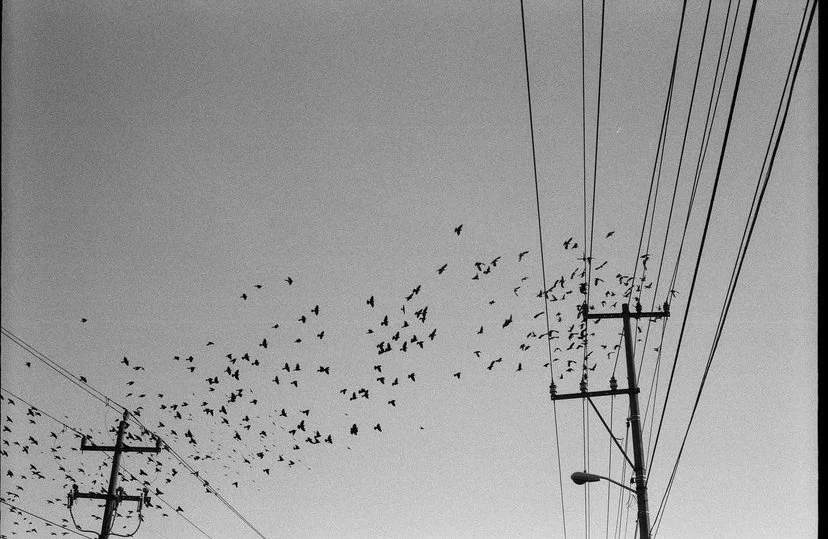 Black and white photo of a person lying face down on the floor with arms extended, wearing jeans and a dark shirt.