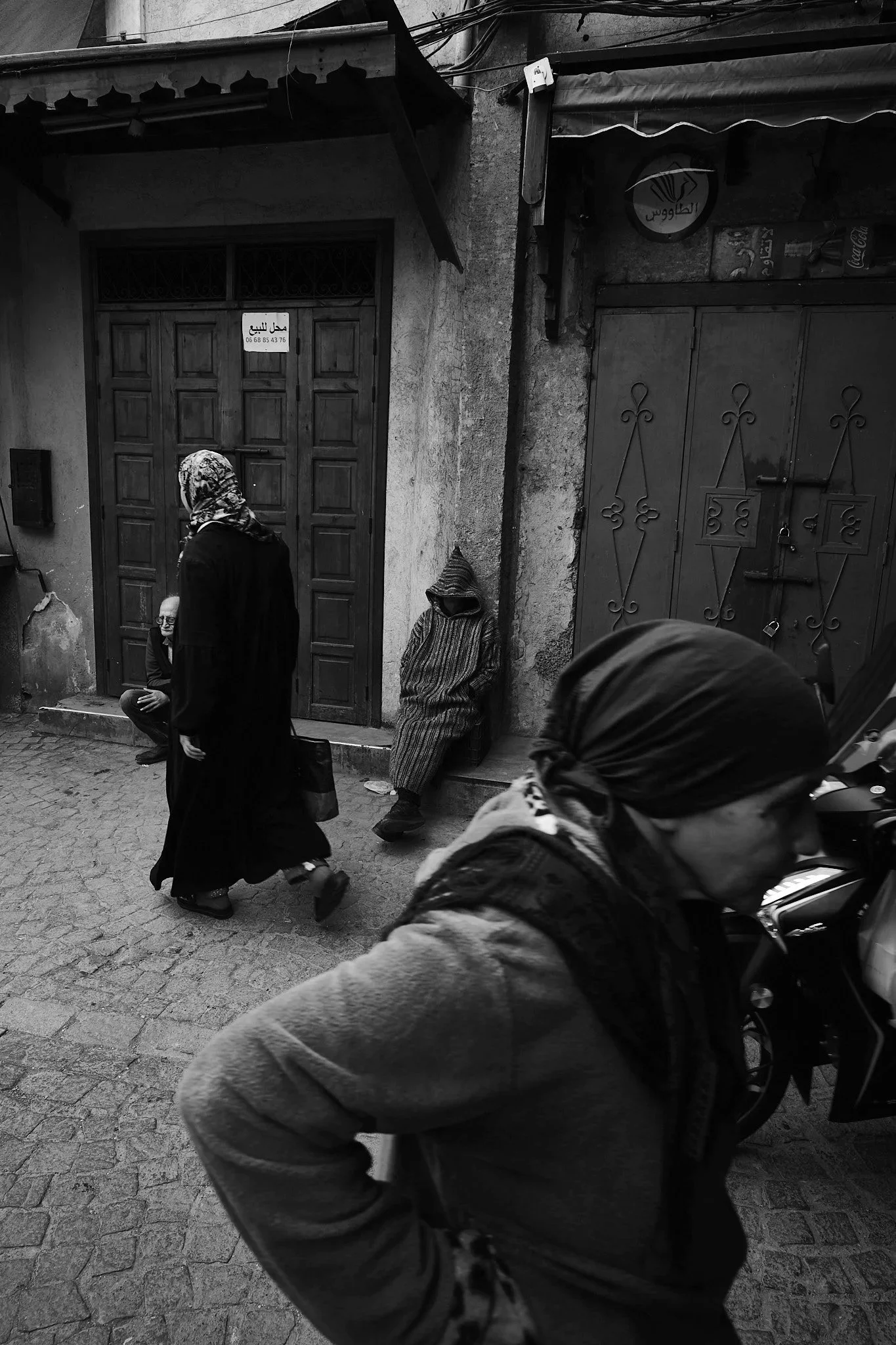 Black and white portrait of a woman wearing a leather jacket, with her hair styled in a bun, partially obscured by light and shadow.
