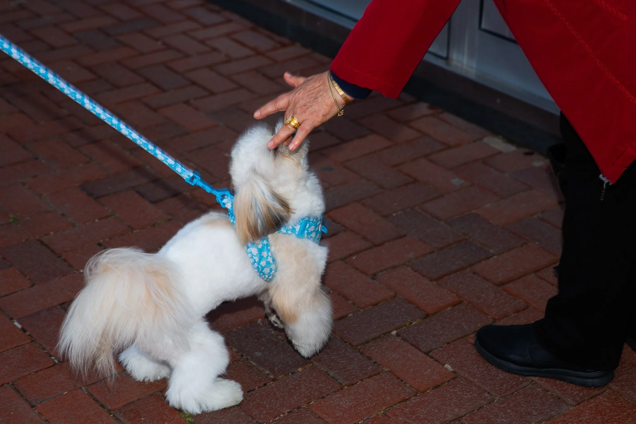 Young man with short, bleached hair looking at the camera, wearing a striped sweater over a collared shirt, with a necklace, sitting on a chair, with a dog in the background